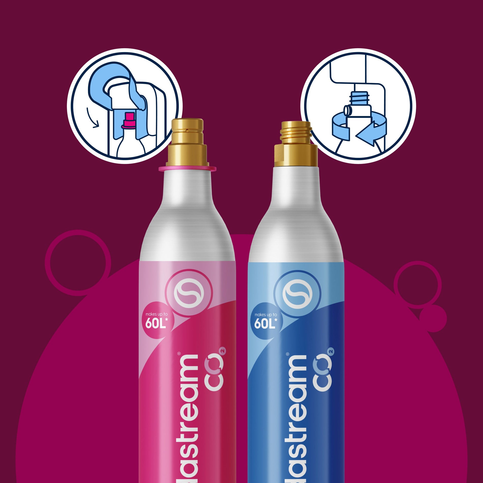 De Quick Connect cilinder, met de roze greep, klik je eenvoudig vast – zonder draaien of gedoe. Je bubbels vastzetten in één beweging. De klassieke schroefcilinder, herkenbaar aan de blauwe greep, draai je stevig vast in de achterkant van je machine. Betrouwbaar, robuust en net zo effectief voor constante bubbels.