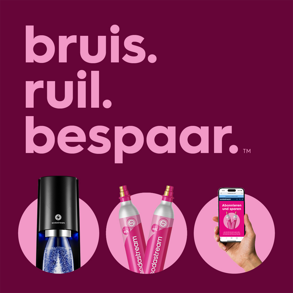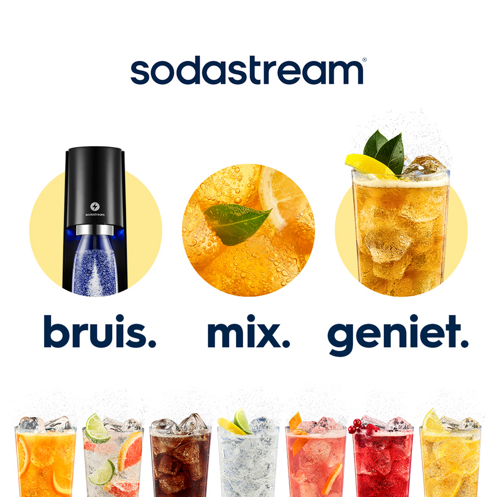 Bruisaanwijzing: De totale inhoud van de flessen is groter dan de hoeveelheid water die je in de fles mag doen om er bruiswater van te maken. Bekijk onze gebruikershandleiding voor meer informatie.