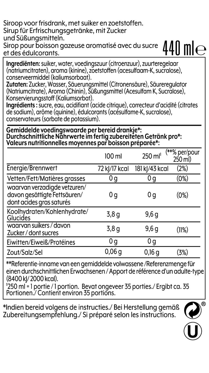Met één fles siroop van SodaStream maak je maar liefst 9 liter bruisende drank, die je in een handomdraai vers bereidt. Meng de siroop met bruiswater in een SodaStream fles, en je hebt een heerlijk verfrissend drankje, klaar om van te genieten, waar je ook bent. Bekijk de ingrediënten en voedingswaarden in de voedingstabel voor meer details.